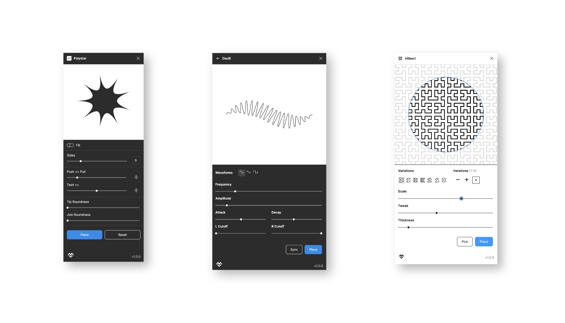 Three generative design plugins for Figma: Polystar creates polygon and star shapes, Oscill transforms any vector path into sine, triangle, or square waveforms, and Hilbert generates intricate patterns from space-filling FASS curves. All three are published on Figma Community.